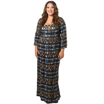 24seven Comfort Apparel Brown Geometric Print Long Sleeve Empire Waist Maxi Dress