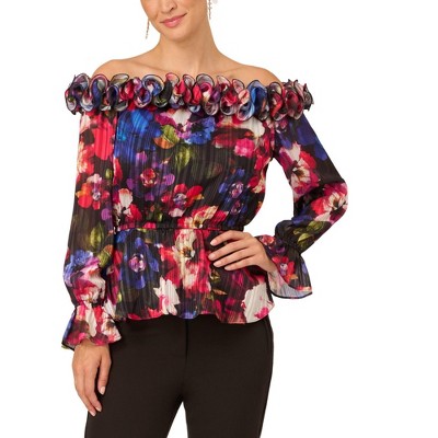 Adrianna Papell Womens Ruffled Floral Off the Shoulder Blouse