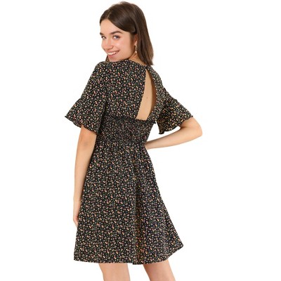 Allegra K Women's Ruffle Elastic Waist Puff Sleeve A-Line Floral Dress