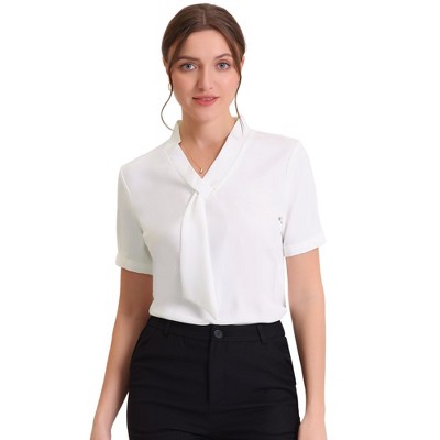Allegra K Women's Work Tie Neck Short Sleeve Satin Elegant Button Down Shirt