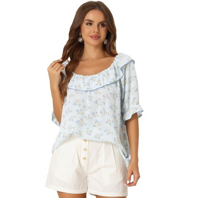 Allegra K Women's Floral Smocked Ruffled Round Neck Half Puff Sleeves Blouse