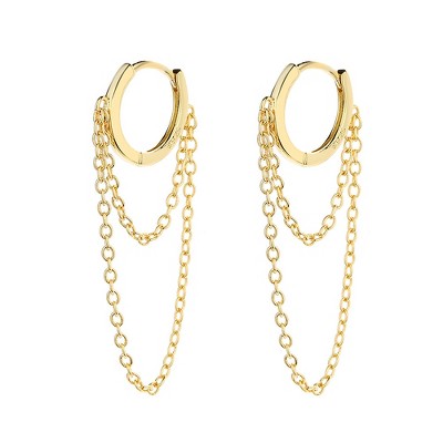 14K Gold Huggie Hoop Double Chain Drop Earring