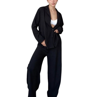 Anna-Kaci Lounge Women's Textured Button Down Pajama Set with Relaxed Fit Long Sleeve Shirt and Wide Leg Pants