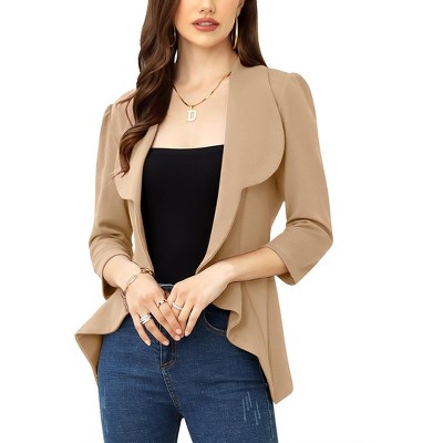 Women's Open Front Waterfall Collar Blazer - 3/4 Sleeve Asymmetric Hem Crop Jacket