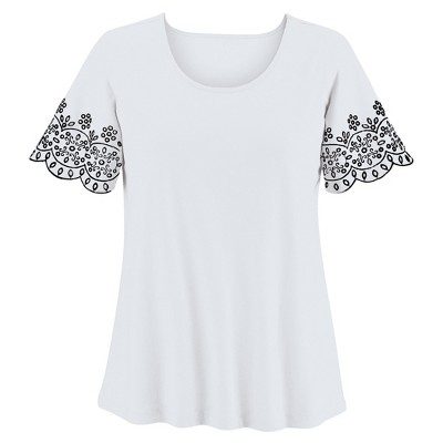 Collections Etc Eyelet and Scalloped Trim Design Short Sleeve Top