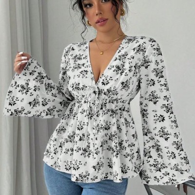 Coolmee Women's Floral Print Blouse Long Sleeve Babydoll Shirt Deep V Neck Peplum Top
