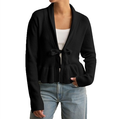 Womens Tie Front Cardigan Sweater Ruffle Hem Long Sleeve Collared Knit Sweaters