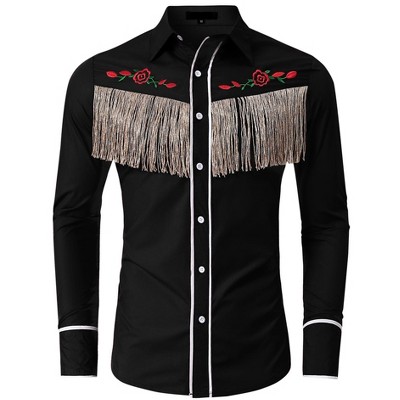 Men's Western Cowboy Fringe Shirt Long Sleeve Rose Embroidered Slim Fit Button Down Shirt