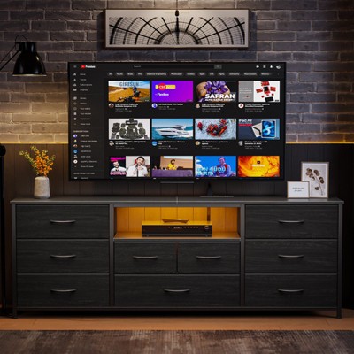 Wide 9 Drawer Dresser for Bedroom with LED Lights Power Outlets Black Fabric Storage Chest 63 Inch Media Console TV Stand for 75 Inch TV Wooden Top