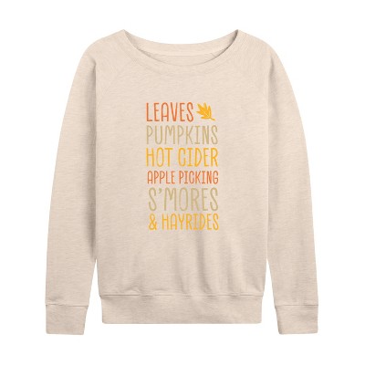 Women's - Instant Message - Fall Bucket List Leaves, Pumpkins, Hot Cider Lightweight French Terry Wide Neck Long Sleeve Graphic Shirt