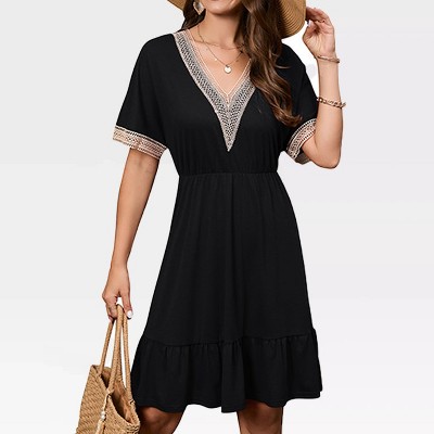 Women's Dress V Neck Summer Casual Dress Lace Trim Sundress Ruffle Hem Casual Midi Beach Cover Up Dress