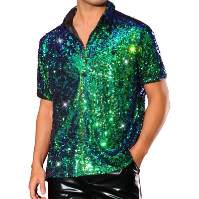 Lars Amadeus Men's Short Sleeve Button Down 70s Disco Costume Party Sparkle Sequin Dress Shirt