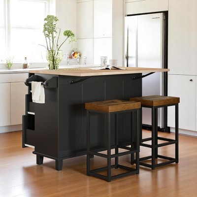 Farmhouse Kitchen Island Set with Drop Leaf,Storage Cabinet,Drawers, Towel Rack and 2 Stools, Dining Table Set with Adjustable Shelf, Kitchen Cabinets