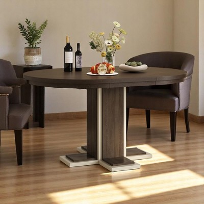 Extendable Oval Dining Table with 16" Leaf, 42"-58" Round Solid Wood Table for 6, Pedestal Table with Double Layer Design for Kitchen or Dining Room