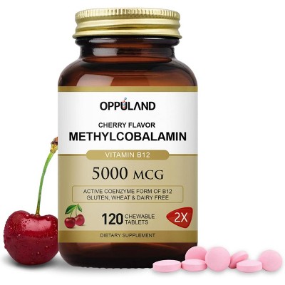 Oppuland Cherry Flavor Methylcobalamin 5000 mcg, Vitamin B12, Gluten, Wheat, & Dairy Free, Dietary Supplement - 120 Chewable Tablets