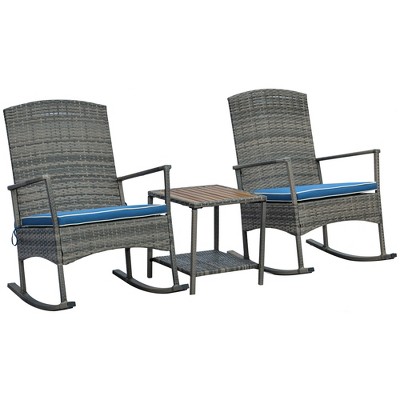 Outsunny 3 Pieces Outdoor PE Rattan Rocking Chair Set, Patio Wicker Recliner Rocker Chair with Soft Cushion & Nature Wood Top Coffee Table, for Garden Backyard Porch