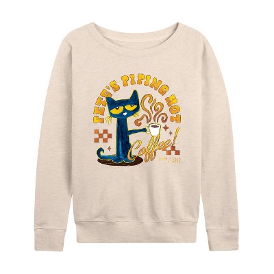 Women's - Pete the Cat - Piping Hot Coffee Lightweight French Terry Wide Neck Long Sleeve Graphic Shirt