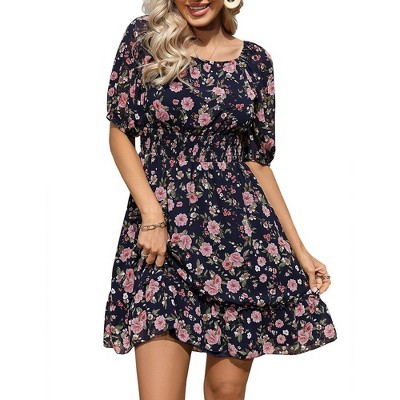 WhizMax Women's Floral Print Square Neck Puff Sleeve Empire Waist Smocked Ruffle Mini Dress Chiffon Flowy Summer Party Dress