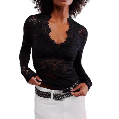Women's Top V Neck Lace Long Sleeve Sheer Blouse Elegant Hollow Out Top