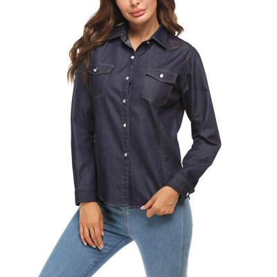 Zeagoo Women's Collared Long Sleeve Denim Button-down Shirt with Pockets Blue XXL