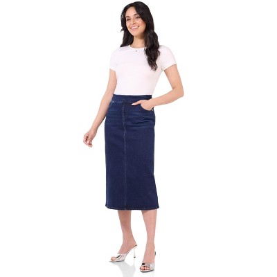 Rekucci Women’s Secret Figure Pull-On Stretch Denim Midi Skirt – Mid-Rise Slim Fit Jean Skirt with 5 Pockets, Back Slit & Sculpting Comfort