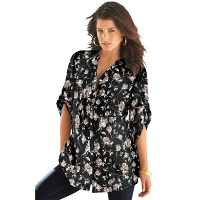 Roaman's Plus Size Floral Y-Neck Pintuck Tunic – Adjustable Long Sleeve Button-Front, Relaxed Shirt Style
