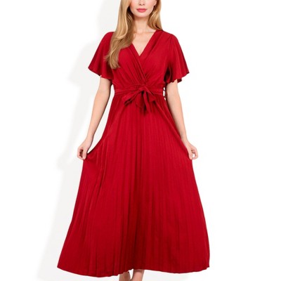 Anna-Kaci Women's V-Neck Flutter Sleeve Maxi Dress with Pleated Skirt and Waist Tie- Small, Burgundy