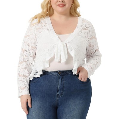 Agnes Orinda Women's Plus Size Lace Tie Front Sheer Long Sleeve Casual Crop Cardigans