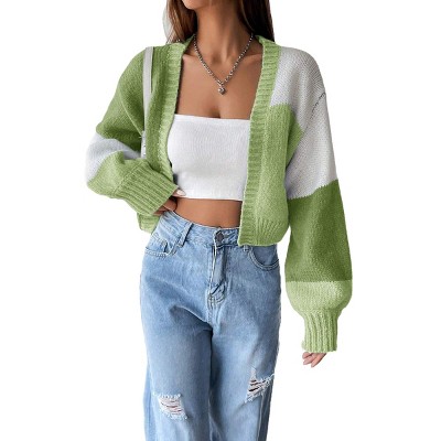 Womens Sweater Cardigan Long Sleeve Cropped Cardigan Color Block Open Front Sweater with Lantern Sleeve Trendy Sweaters