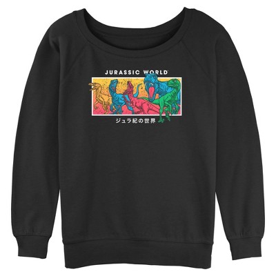 Juniors Womens Jurassic World Colorful Dinosaur Panel Art Sweatshirt