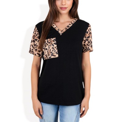Anna-Kaci Women's V-Neck Leopard Print Pocket Tee with Contrast Sleeves Casual Relaxed Fit