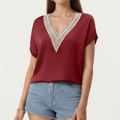Anna-Kaci Short Sleeve V Neck Blouse with Crochet Trim Detail