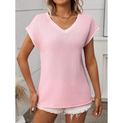 Coolmee Women's Summer Sweaters Lightweight V-Neck Short Cap Sleeve Blouses Soft Loose Fit Contrast Trim Breathable Casual Pullover Knit Tops S Pink