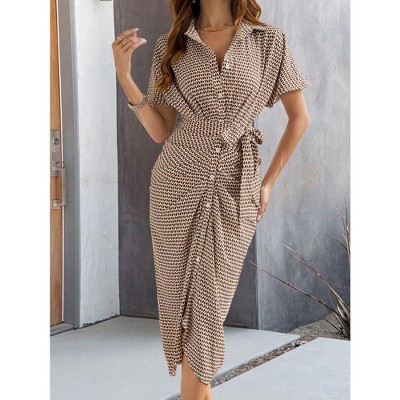 Women V-neck Button Down Dresses Short Sleeve Midi Shirt Dress with Belt