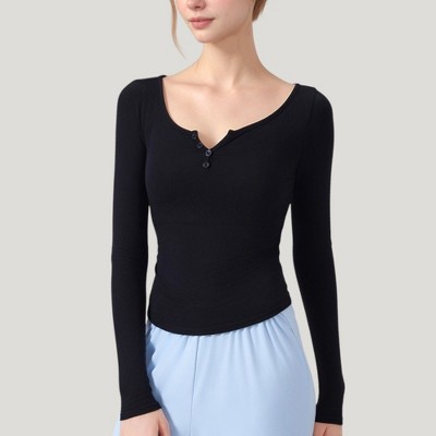 Anna-Kaci Active Women's Long Sleeve Henley Activewear Top with Scoop Neckline and Streamlined Fitted Silhouette