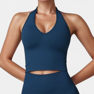 Anna-Kaci Active Women's Seamless Ribbed Knit Halter Crop Top with V-Neckline and Built-In Support