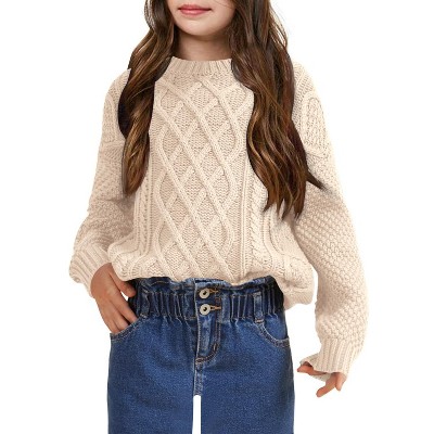 Girls Long Sleeve Cable Knit Sweater Crewneck Pullover Sweaters Kids Chunky Cute Fall Jumper Tops