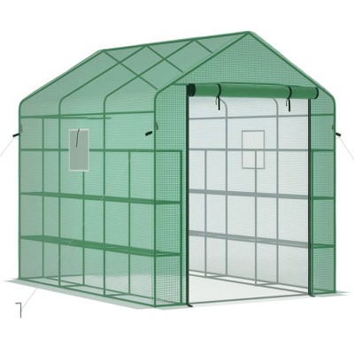 Outsunny Outdoor Walk-In Greenhouse, Plant Nursery with Roll-up Window, PE Cover, and 3-Tier Wire Shelves