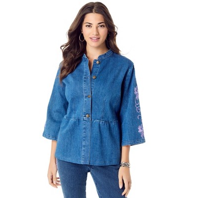 Roaman's Embroidered Button Front Peplum Denim Jacket