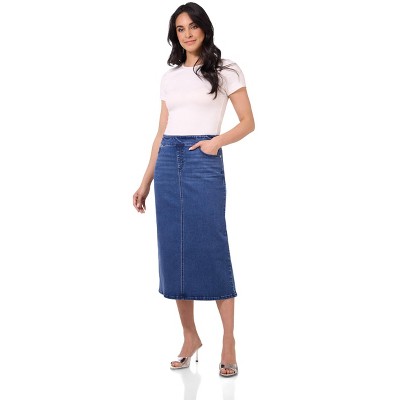 Rekucci Women’s Secret Figure Pull-On Stretch Denim Midi Skirt – Mid-Rise Slim Fit Jean Skirt with 5 Pockets, Back Slit & Sculpting Comfort