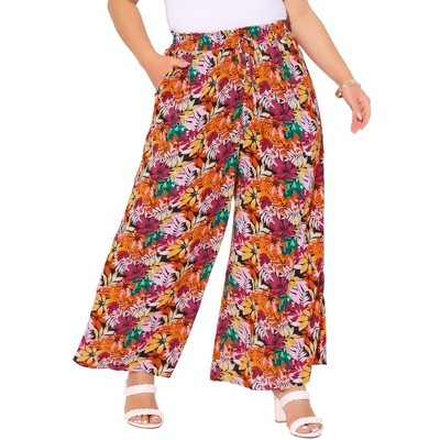 Agnes Orinda Women's Plus Size Chiffon Casual Floral Elastic High Waist Wide Leg with Pocket Palazzo Pants