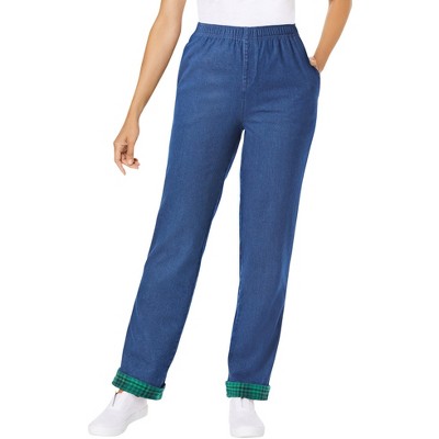 Woman Within Elastic-Waist Cotton Straight Leg Denim Pant With Flannel Lining