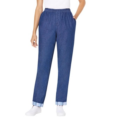 Woman Within Elastic-Waist Cotton Straight Leg Denim Pant With Flannel Lining