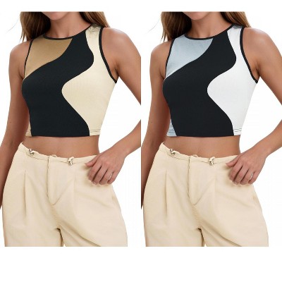 INSPIRE CHIC Women's Color Block Summer Crew Neck Ribbed Sleeveless Crop Going Out Tank Tops 2 Packs