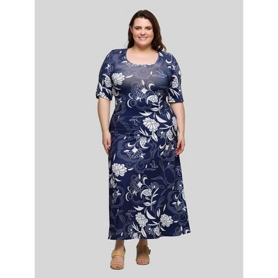 24seven Comfort Apparel Plus Size Blue Floral Print Elbow Sleeve Casual A Line Maxi Dress