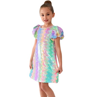 2Bunnies Girls' 5yr-10yr Spectrum Sparkle Sequin Puff Sleeve Dress