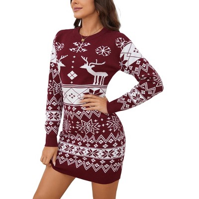 Clearlove Women's Slim Fit Christmas Sweater Dress Long Sleeve Round Neck Elk Floral Print Dress