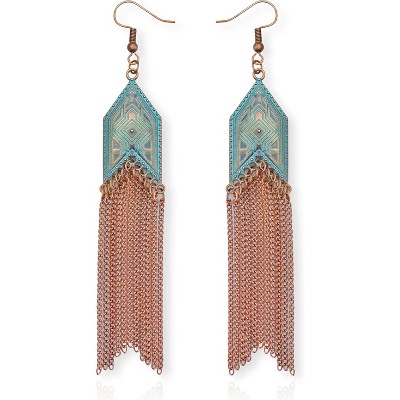 Turquoise & Bronze Dangle Earrings with Long Copper Tassel Chains | Western Style