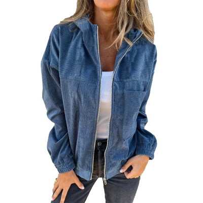 Womens Jackets Corduroy Zip Up Hooded Jacket Pocket Elastic Hem Casual Coat