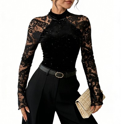 Women's Velvet & Lace Bodysuit - Sparkle Long Sleeve Turtleneck Top for Party, Evening & Holiday
